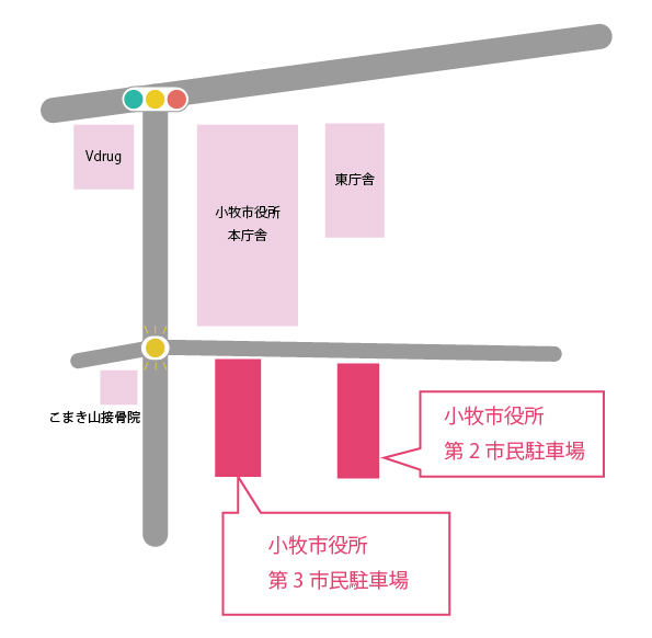 当日、駐車場をご利用の際は、こちらの第2市民駐車場・第3市民駐車場へのご駐車をお願いいたします。